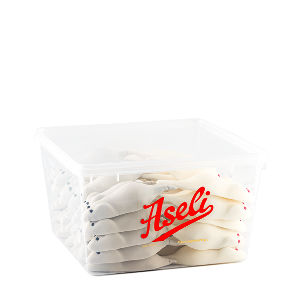 Aseli è un'azienda familiare alla terza generazione. Queste toffolette a forma di animaletti vengono prodotte a Berlino secondo le antiche ricette di famiglia. Formati, cotti e confezionati a mano dal 1921, i topolini giganti Aseli sono privi di glutine e lattosio e contengono solo coloranti e aromi naturali.